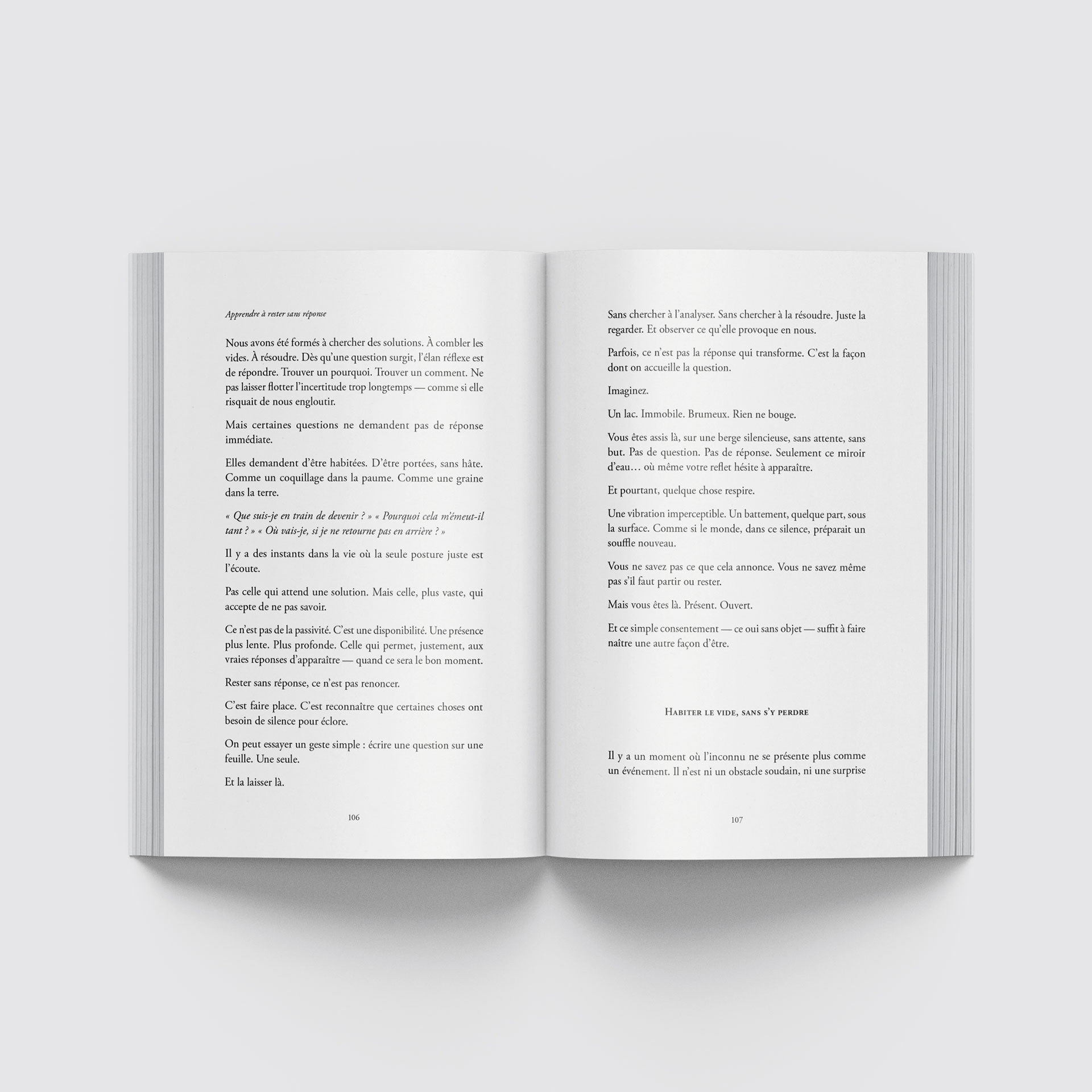 L’essai explore d’abord les moments où tout vacille — ces hésitations minuscules qui freinent nos élans. Puis il traverse les peurs universelles : l’échec, le regard des autres, le changement, l’inconnu. Non pour les dompter, mais pour comprendre ce qu’elles révèlent : un désir enfoui, une vérité timide, une direction encore voilée.